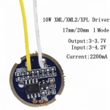 Светодиодный драйвер тока для светодиодных фонариков, входное напряжение 3.0В - 4.2В, выход 3.0В - 3.7В 2.2А, диаметр подложки 17мм, для светодиодов P7, XML-T5, XML-T6, XML2, XPL и других светодиодов мощностью 5-10Вт. 5 режимов работы (5-mode) - выбираются последовательно при коротком нажатии на включение - большая яркость, средняя яркость, малая яркость, "стробоскоп", "SOS".