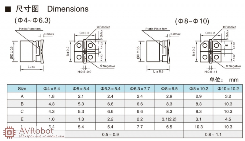 Конструктивно электролитические SMD конденсаторы в зависимости от габаритных размеров корпуса подразделяются на несколько типоразмерных групп: B (4x5,4), C (5x5,4), D (6,3x5,4), E (8x6,5), F (8x10,5), G (10x10,5), H (6,3x7,7).