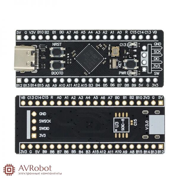 Плата построена на микроконтроллере STM32F401CCU6 и предоставляет все возможности для ознакомления с новым контроллером. На плате установлены кнопка сброса, входа в загрузчик, пользовательская кнопка (на PA0), которую можно использовать в своих проектах, пользовательский светодиод и светодиод индикации питания (на PC13).