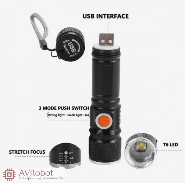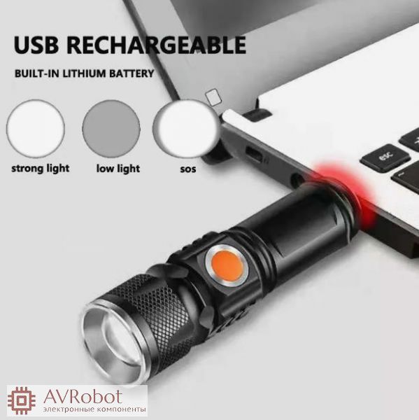 Удобный в использовании фонарик с режимом зарядки от USB, вы можете зарядить его от любого устройства с выходом USB, например: ноутбук, компьютер, powerbank и т.д.