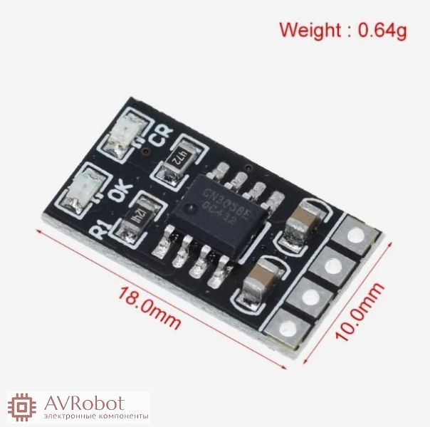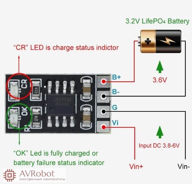 Зарядное устройство для LiFePo4 аккумуляторов 3.2В/3.6В 1А на CN3058E, напряжение полной зарядки 3.6В, вход 3.8 - 6.0В