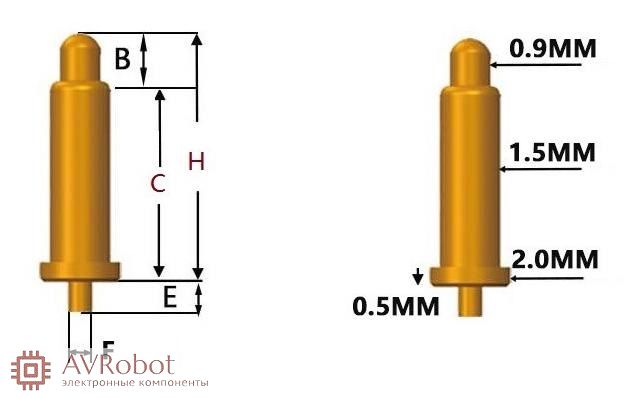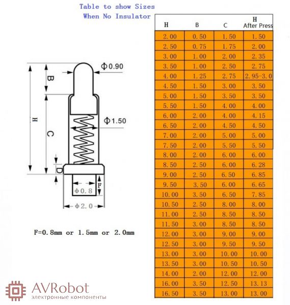 | Номер модели контакта | Высота над печатной платой "H" | Высота подвижного контакта "B" | Высота трубки "C" | Высота после нажатия "H1" | Диаметр контакта "F" | Высота контакта "Е" | Примечание |