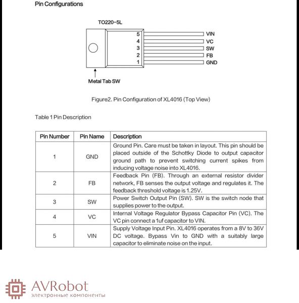 Микросхема XL 4016 понижающий импульсный регулируемый преобразователь напряжения - входное напряжение от 8 до 40 вольт, выходное напряжение от 1.25 до 36 вольт регулируемое, выходной ток до 8A, корпус TO220-5L для поверхностного монтажа.