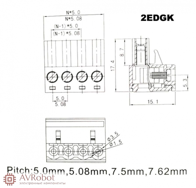 Для провода 0.5мм (30AWG) мин. до 2.5мм (14AWG) макс. Длина зачищаемой части провода -7.5мм. Шаг контактов - 5.08мм. Винт: М2.5.