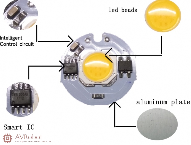 Организация: 9Вт COB-светодиод со схемой питания и стабилизации тока 220-240В AC/DC
