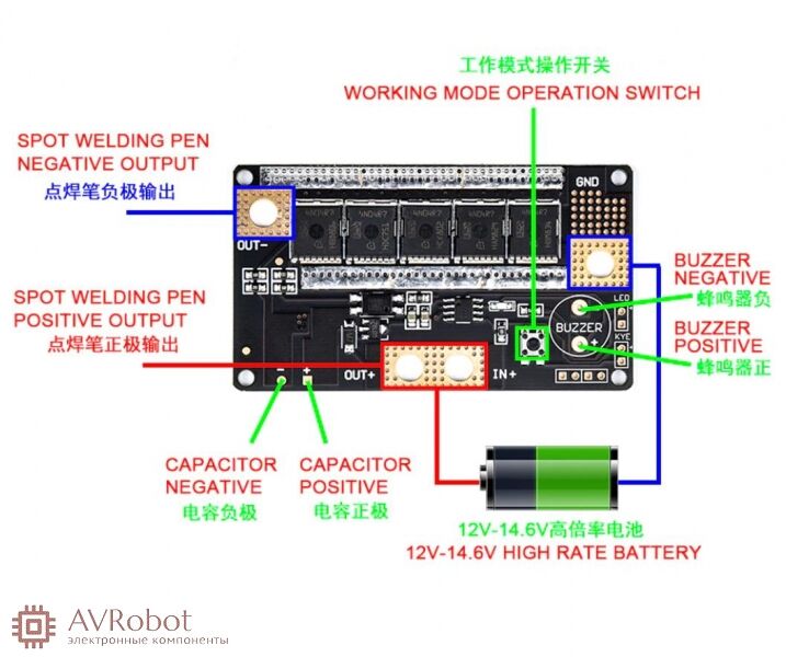 Это набор для самостоятельной сборки сварочного аппарата точечной сварки для литий-ионных элементов типа 18650/26650/32650. Напряжение питания 12-15В, ток сварки 90-130А.
