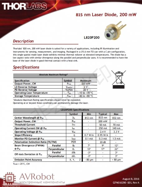 Лазерный диод лабораторный инфракрасный 815nm 200мВт TO18 (5.6 мм) с номинальным напряжением питания 2.4В.