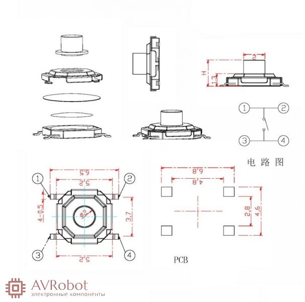 Кнопка тактовая SMD 5.2 * 5.2 * 3 мм (водонепроницаемая) TS-1252