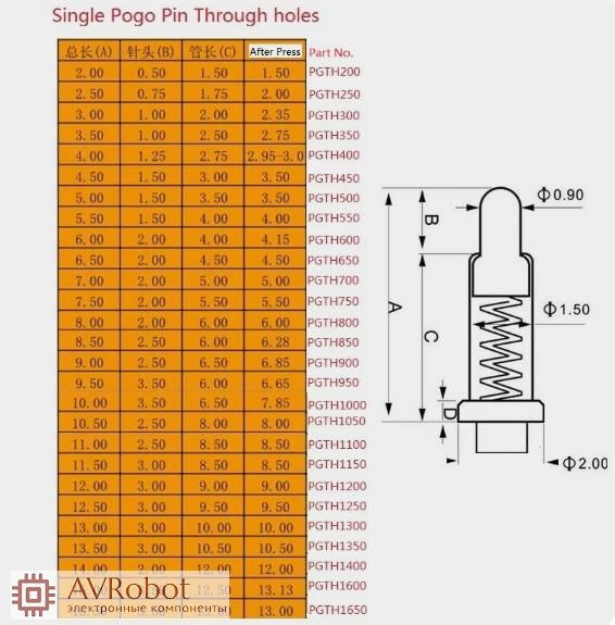 | Номер модели контакта | Высота над печатной платой "H" | Высота подвижного контакта "B" | Высота трубки "C" | Высота после нажатия "H1" | Диаметр контакта "F" | Высота контакта "Е" | Примечание |