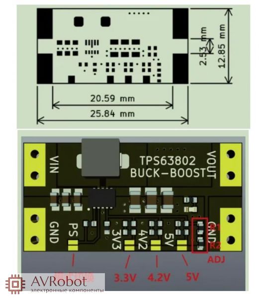 Модуль XL63802 со специальной схемой регулирования напряжения на ИМС TI TPS63802, с низкой пульсацией на выходе и стабильной производительностью. Частота переключения превышает 1,4 МГц, а выходной ток может достигать 1.2А. Модуль имеет предустановку на фиксированное напряжение (3.3В), но может перемычками выбрать другое напряжение на выходе: 3.3В, 4.2В и 5В, которые подходят для различных ситуаций, - например для микроконтроллеров 3.3В или 5В для использования с литиевыми аккумуляторами и/или USB для питания. Модуль может работать в двух режимах на выбор пользователей: обычный рабочий режим и энергосберегающий режим. Модуль представляет собой типичную структуру BUCK-BOOST - то есть повышения или понижения напряжения, в зависимости от входного напряжения и требуемого выходного напряжения. Диапазон входного напряжения 1.3В - 5.5 В (требуется выше 1.8 В для запуска) и выходным током более 1 А, отвечающие потребностям в питании различных моделей, таких как STM32, ESP32, микроконтроллер 51 и т. д. Плата оснащена красным светодиодным индикатороми выхода и поддерживает режим энергосбережения для увеличения срока службы батареи входных устройств, таких как батареи (для энергосбережения - замкнуть перемычку PS).